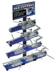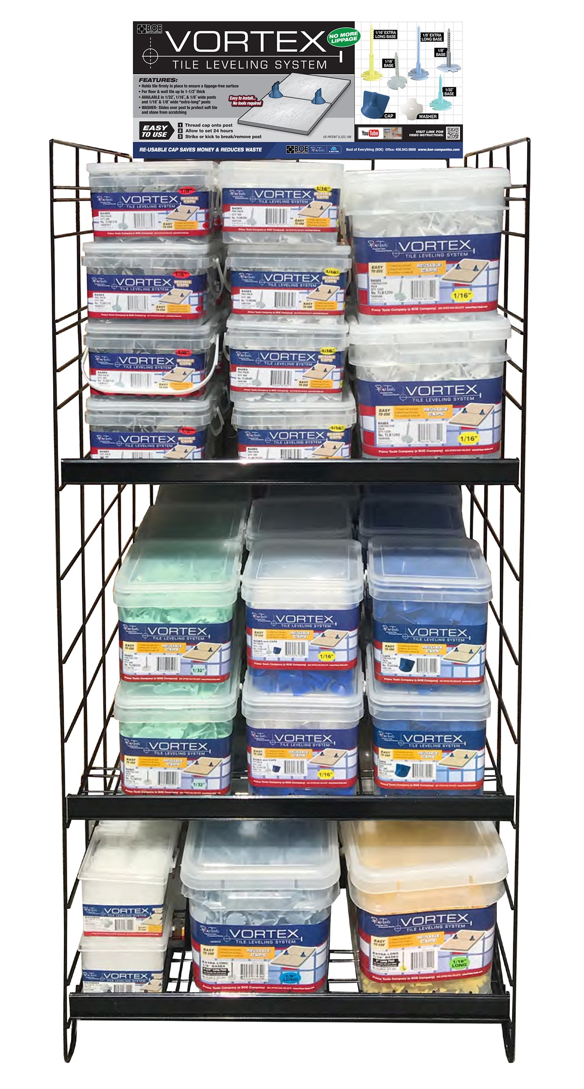 We created a highly versatile display that measures 27” H x 24” W X 28” D and can be used to display our top selling Vortex Leveling System and/or Spacers/Shims. We have separate header signs depending on the products merchandised on the display(s).